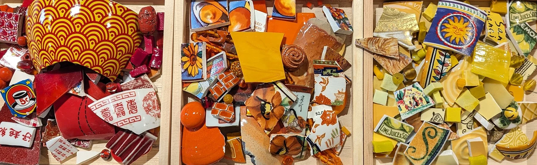 Learn the basics of mosaic art in this beginning workshop. We’ll make a small mosaic and focus on technique, cutting, placement and design using a variety of materials from glass to ceramic.